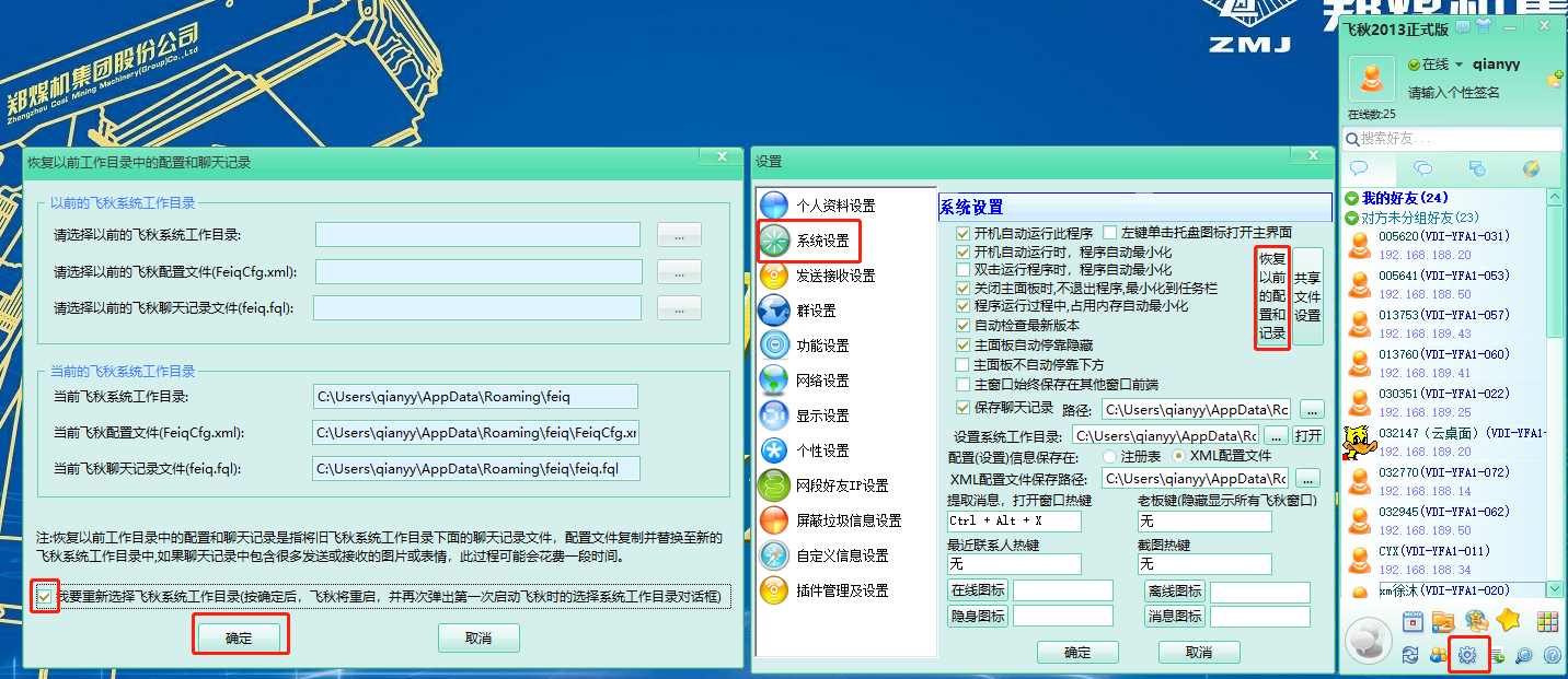 若工作目录选择错误,需要重置工作目录,打开【设置】,点击【系统设置】,点击【恢复以前的配置和记录】,勾选【我要重新选择飞秋系统工作目录】
