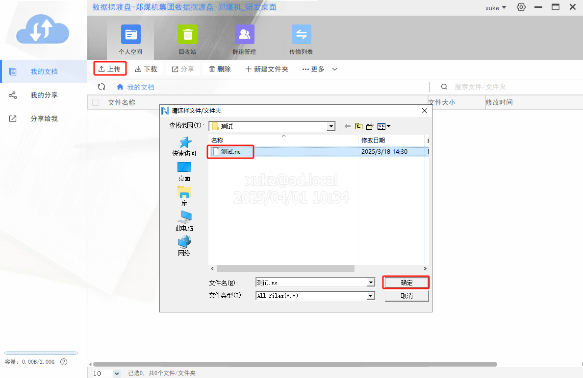 2.点击【上传】,在弹出的选择框中选择需要上传的文件,点击确定