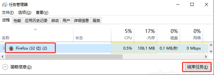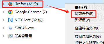 处理方法:将火狐浏览器结束进程重新打开即可。 1.鼠标右键单击状态栏,点击任务管理器; 2.在后台进程中找到Firefox,鼠标右键单击-结束任务; 或鼠标左键点击选中后在任务管理器右下角选择结束任务;