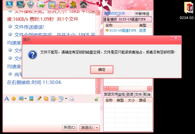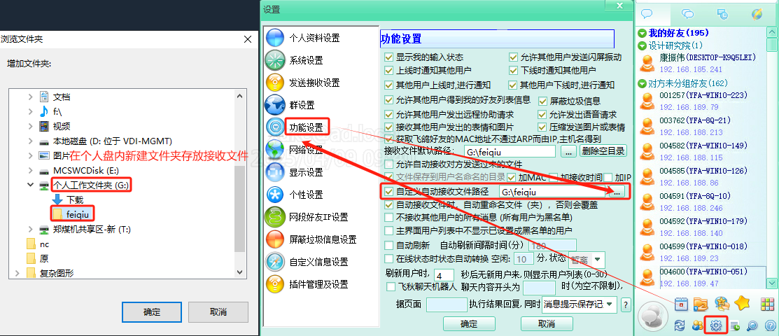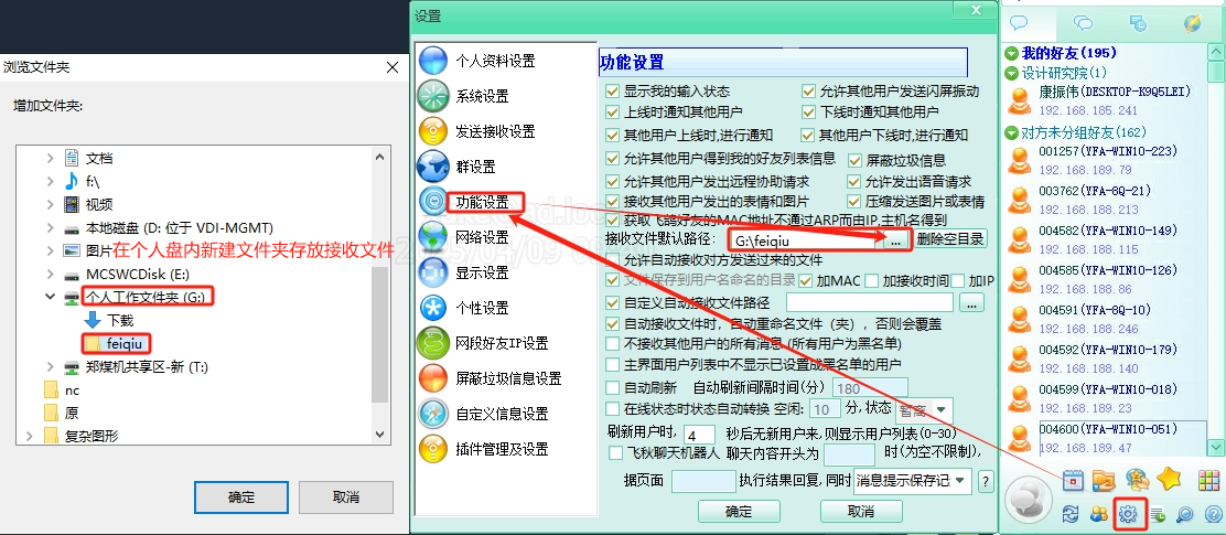 当飞秋接收文件时出现报错提示: 出现此报错用户可更改飞秋接收文件路径设置 【设置】-【功能设置】-【接收文件默认路径】-【feiqiu(个人盘内新建文件夹存放接收文件)】 用户需自定义自动接收文件路径: 【设置】-【功能设置】-【自定义自动接收文件路径】-【feiqiu(个人盘内新建文件夹存放接收文件)】