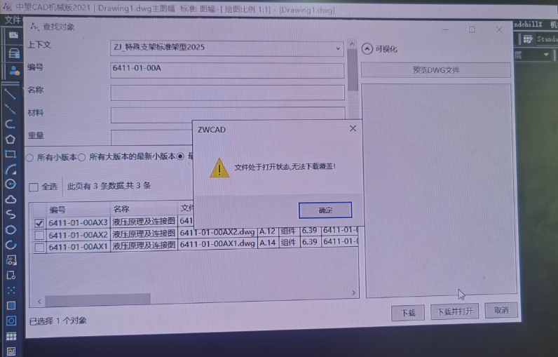 当使用中望CAD下载图纸时提示“文件处于打开状态,无法下载覆盖”