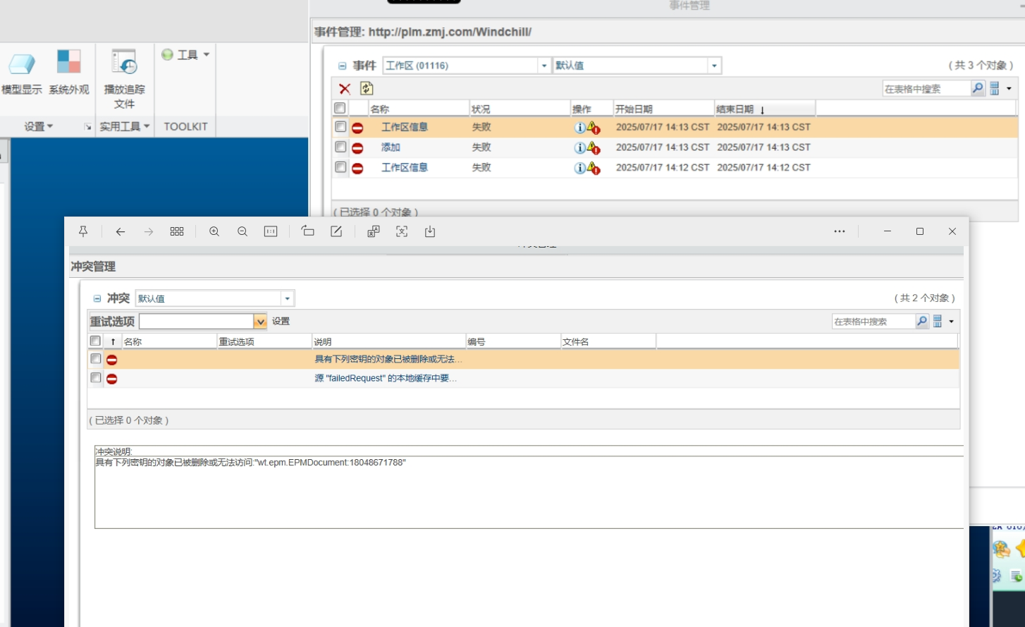 Creo进行检索操作时左下角提示“不能检索”,查看事件管理报错为“具有下列密钥的对象已被删除或无法访问:”wt.epm.EPMDocument: 18048671788″”,此问题为PLM系统问题,出现此报错信息需联系PLM管理员进行处理。